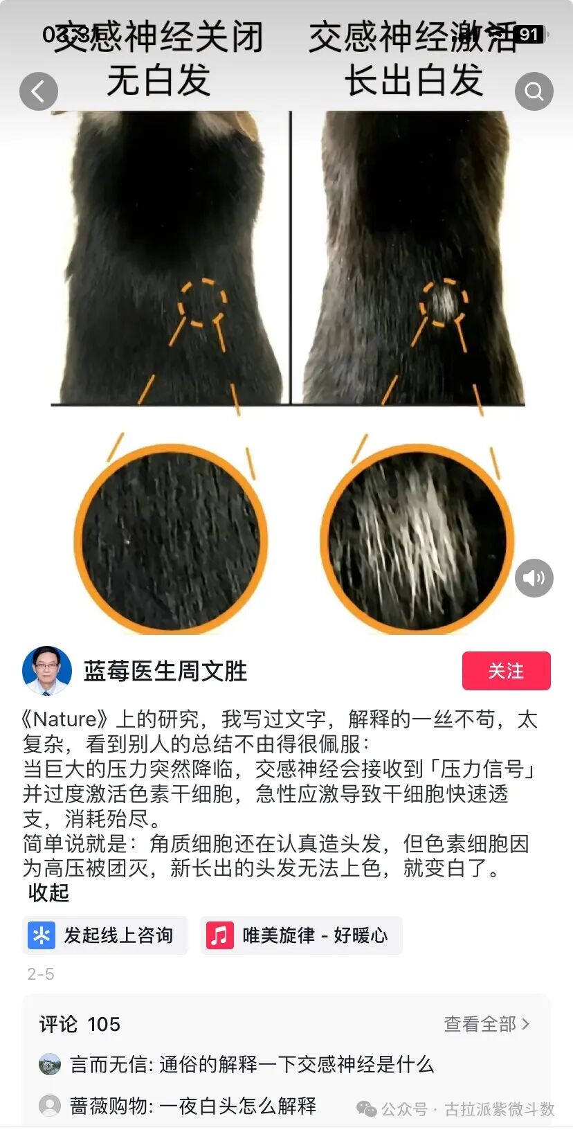 按照论文上过《nature》的医生说的“神经接收到压力信号,过度激活色素干细胞”,组合就是廉贞(神经、电磁、压力、信号、毛发)化禄(增多)+破军(水、油脂、肉、色素干细胞)化权(涌出、中断、毁灭、破坏)+天相(覆盖、复制、表层、皮肤)